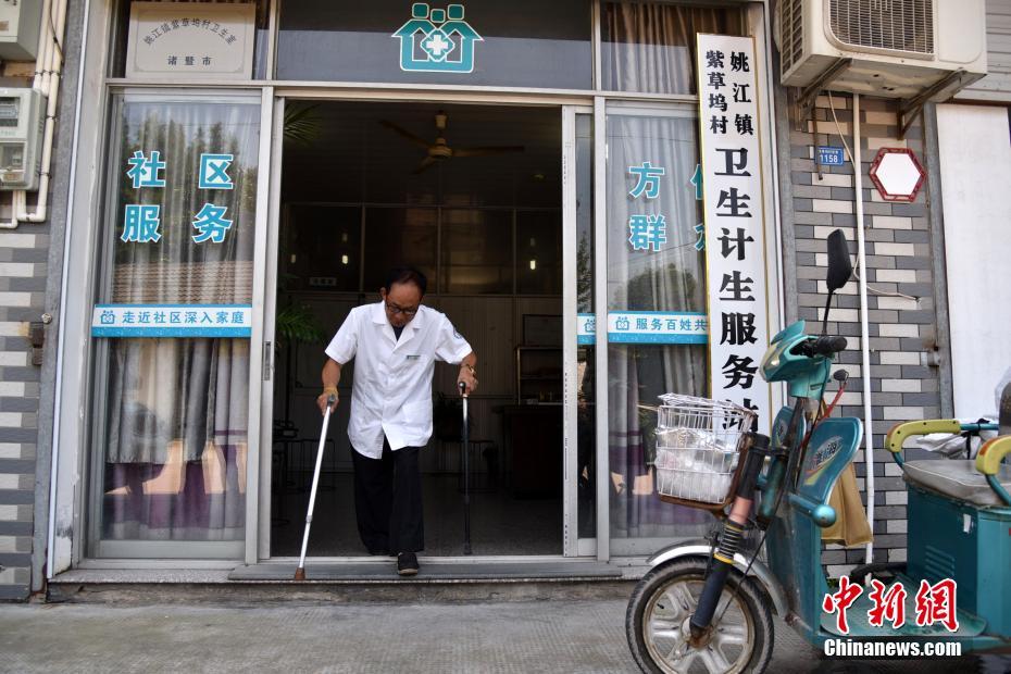 7月22日,史伟兵拄拐走出紫草坞村社区卫生服务站。今年65岁的史伟兵是浙江省诸暨市姚江镇卫生院紫草坞村社区卫生服务站的一名医生,被村民亲切地唤作“拐杖村医”。中新社记者 范宇斌 摄