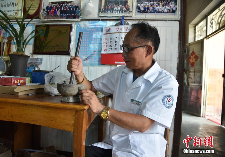 他出生3个月患上小儿麻痹症,落下了终身残疾,1976年,他在村里的推荐下开始为村民出诊、治疗,背着药箱奔波于乡野间。图为史伟兵在捣制中草药。中新社记者 范宇斌 摄