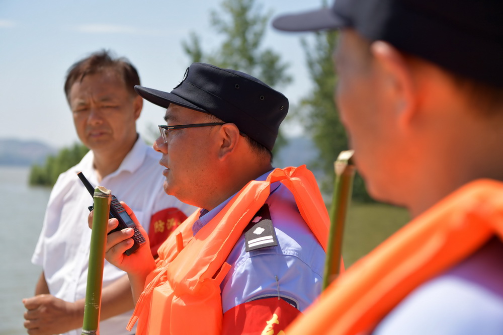 7月22日,梅玉胜(中)和同事们在防洪堤坝上巡逻,他通过对讲机和其他小组的同事沟通。