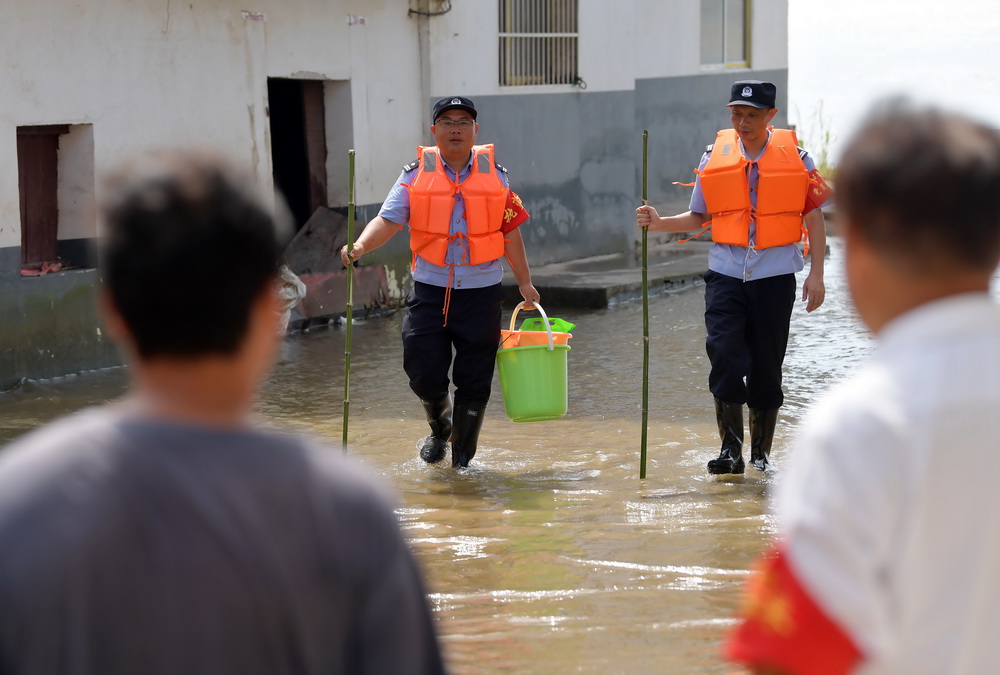 7月22日,梅玉胜(左二)和同事蹚水帮助一名家中进水的居民拿取生活必需品。