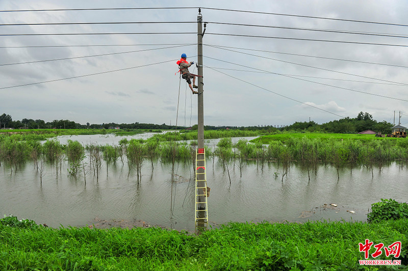 2020年7月23日,江苏镇江江心洲,电力员工正在水淹没的线杆上接照明临时电源。宋伟/人民视觉