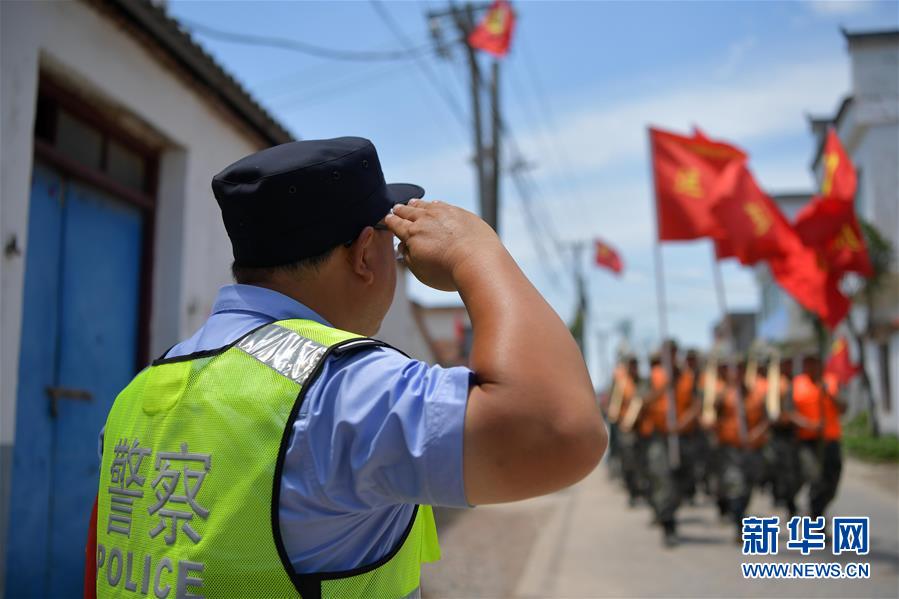 7月22日,梅玉胜向经过他们驻点的参加防汛抗洪的战士敬礼。新华社记者 彭昭之 摄