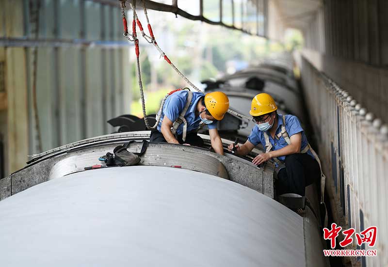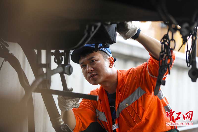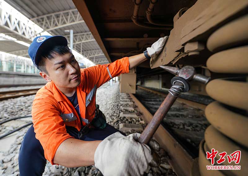 2020年7月24日,南昌车辆段驻站检车员在检查车辆制动管状态。(图片来源:视觉中国)