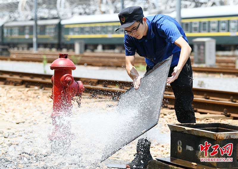 2020年7月24日,南昌车辆段的职工顶着高温在江西九江铁路客技站清洗客车空调过滤网。(图片来源:视觉中国)