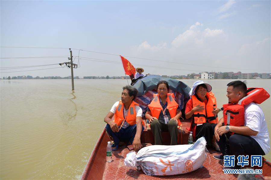 在江西省鄱阳县昌洲乡马湖村,高建(右一)与拿到物品的村民一同乘船离开,返回安置点(7月24日摄)。新华社记者 彭昭之 摄
