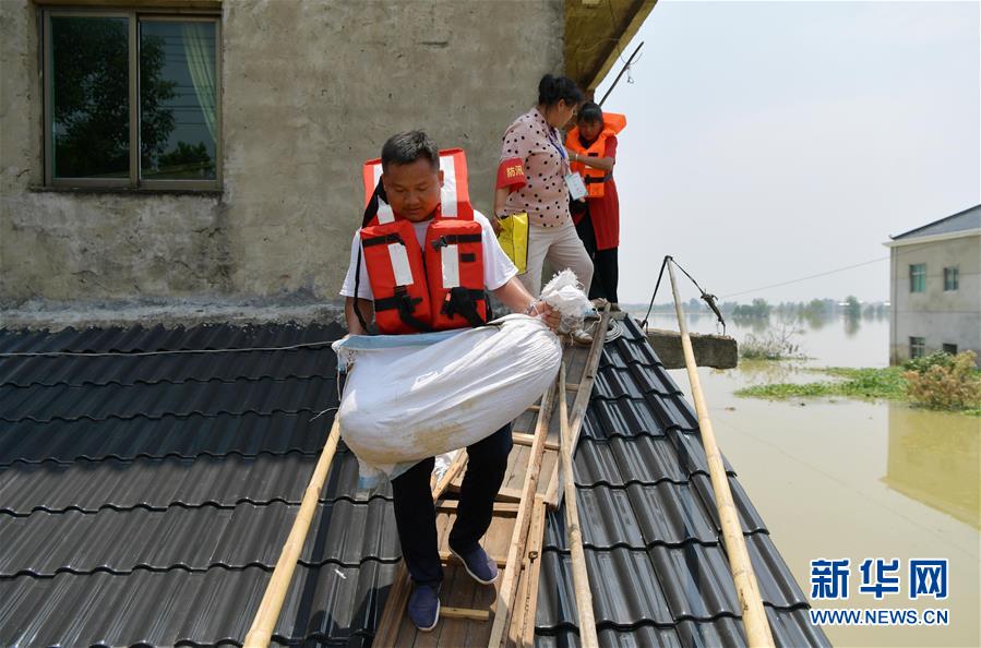 在江西省鄱阳县昌洲乡马湖村,高建(前)和徐小花(中)帮助村民陈留娇回家拿取物品(7月24日摄)。新华社记者 彭昭之 摄