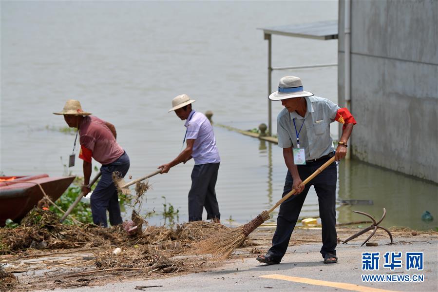 在江西省鄱阳县昌洲乡马湖村,留守工作人员打扫清理村庄(7月25日摄)。新华社记者 彭昭之 摄