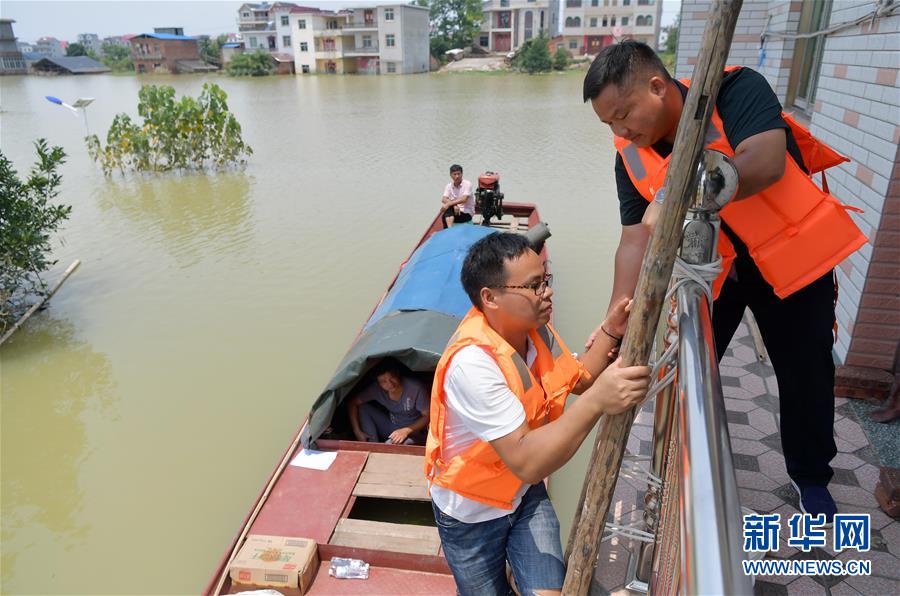 在江西省鄱阳县昌洲乡马湖村,高建(右)陪村民徐金达回家帮女儿拿取学习和生活用品(7月25日摄)。新华社记者 彭昭之 摄