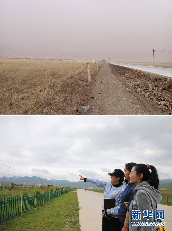 拼版照片:上图为岗岔村村道绿化改造前的面貌(资料照片)。 下图为7月23日,卓玛吉(右一)和驻村帮扶工作队队员站在绿化改造后的岗岔村村道上,谋划下一步的工作。新华社发(杜哲宇 摄) 岗岔村是甘肃省甘南藏族自治州夏河县桑科镇的一个牧业村,平均海拔3000米以上。2018年,在夏河县文明办工作的卓玛吉开始担任驻村帮扶工作队队长,每年都有200多天待在草原上。 两年来,卓玛吉带领大家开办扶贫车间,发展特色产业,联系劳务输出。为了让村民更全面地了解精准扶贫政策,卓玛吉登门宣讲政策。为了提高村容村貌,卓玛吉发动大家开展厕所革命和庭院环境评比,积极响应甘南藏族自治州“全域无垃圾”创建行动。她还从县城请来医生,为村民举办健康讲座,在全村妇女中开展“两癌筛查”。 如今,岗岔村变成了干净、整齐、富裕、美丽的生态文明村,提前实现了整村脱贫。谈起心愿,卓玛吉说:“要让草原和草原上的人都变得更美。” 新华社发