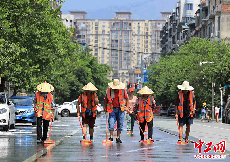 2020年7月25日,广西柳州市融安县出现高温天气,融安县气象台连续发布高温黄色预警信号,为使创自治区级文明城市进一步推进,城市执法局组织环卫工人顶高温、冒酷暑,对县城主要街道进行冲洗作业,对沿街两侧环境卫生进行彻底整治,为市民营造干净宜居的生活环境,为创建自治区级文明城市贡献力量。(谭凯兴/视觉中国)