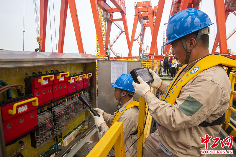7月25日,江苏泰州,在常泰长江大桥建设工地上,泰州供电公司配网不停电作业中心工作人员顶着炎炎烈日,为常泰长江大桥建设工地专供10kV线路进行不停电更换发热刀闸工作,确保常泰长江大桥项目建设用电可靠。(汤德宏/视觉中国)