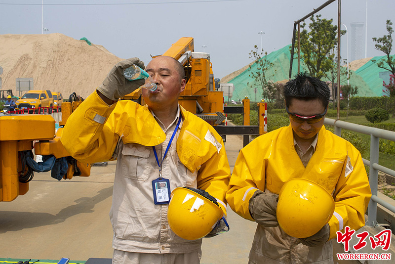 7月25日,江苏泰州,泰州供电公司配网不停电作业中心工作人员为常泰长江大桥建设工地专供10千伏线路进行不停电更换发热刀闸,工作结束后饮水降温。(汤德宏/视觉中国)