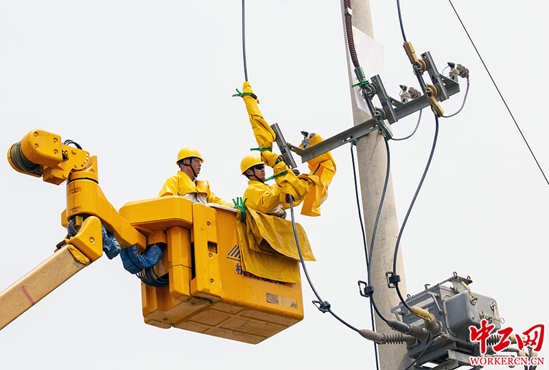 7月25日,江苏泰州,泰州供电公司配网不停电作业中心工作人员为常泰长江大桥建设工地专供10千伏线路进行不停电更换发热刀闸。(汤德宏/视觉中国)