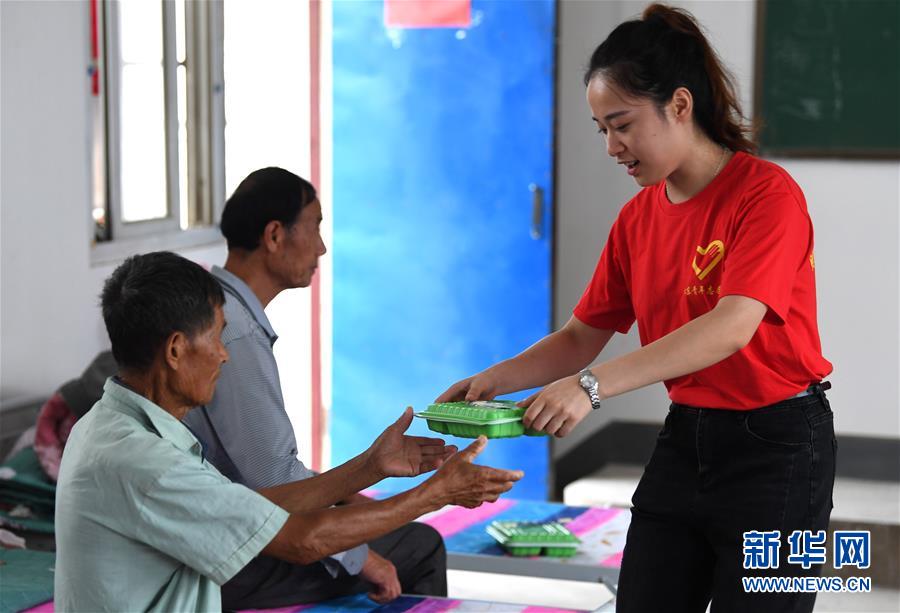 7月28日,在肥东县长临河中学安置点,周平平(右)给安置点的居民送午饭。 新华社记者 刘军喜 摄