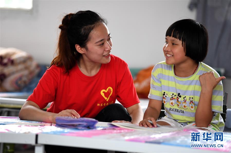 7月28日,在肥东县长临河中学安置点,周平平(左)辅导安置点的小朋友写作业。 新华社记者 刘军喜 摄