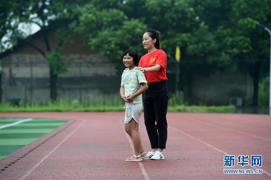 7月28日,在肥东县长临河中学安置点,周平平(右)带安置点的小朋友玩耍。 新华社记者 周牧 摄