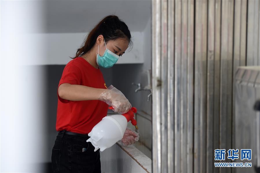 7月28日,在肥东县长临河中学安置点,周平平对安置点的洗手池进行消毒。 新华社记者 周牧 摄