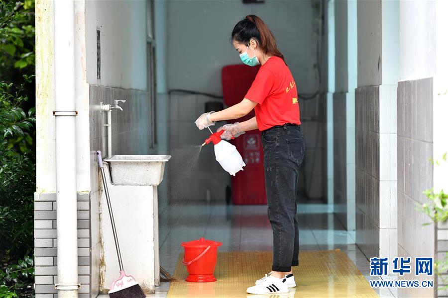 7月28日,在肥东县长临河中学安置点,周平平对安置点的卫生间进行消毒。 新华社记者 李鑫 摄