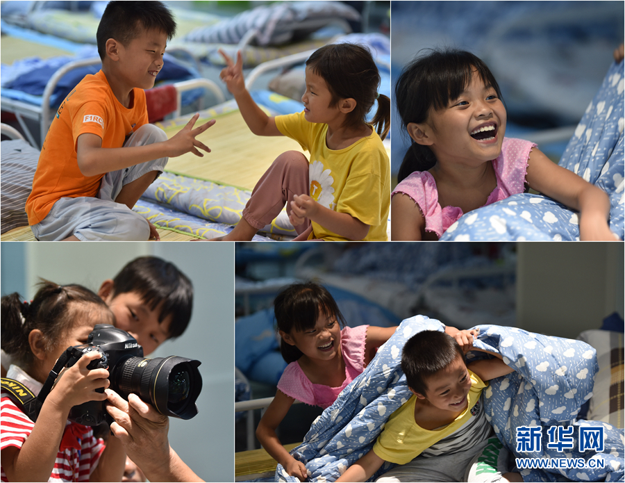 7月26日,夜幕降临,孩子们在简易床上嬉戏玩耍。(拼版图片)