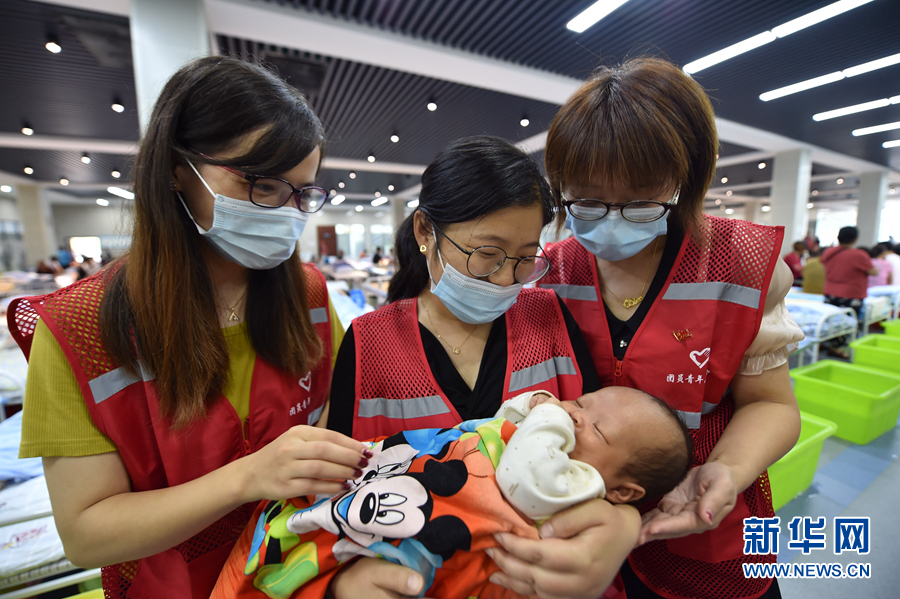 7月27日上午,三名志愿者深情地抱着安置点中仅有44天大的最小村民。