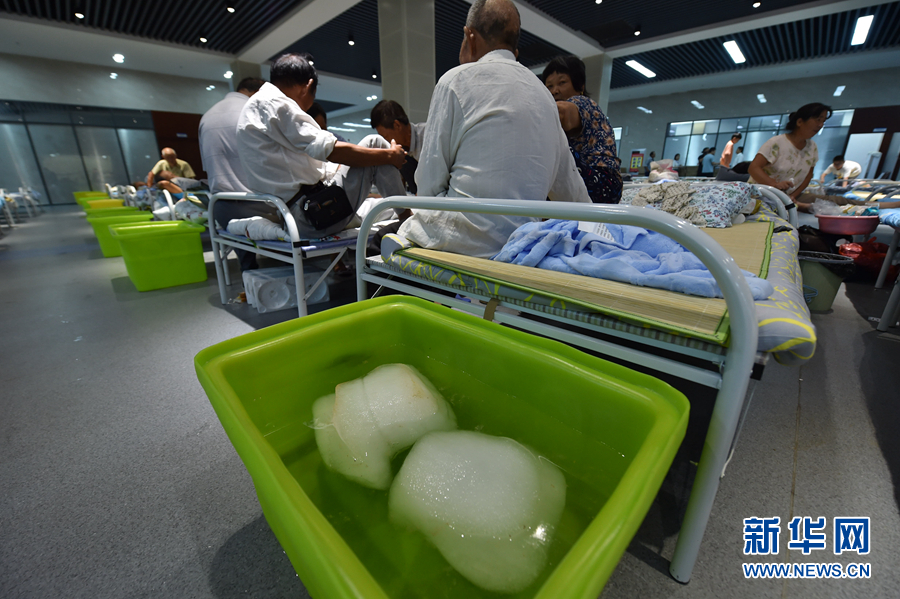 7月26日晚,安置点简易床的床头放上了降温的冰块。