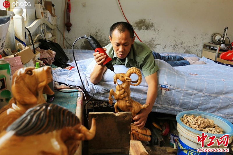 7月11日,李明利因为健康原因,所有作品都是趴在铺上来雕刻完成的。(王启蒙 孙明春/IC photo) P>