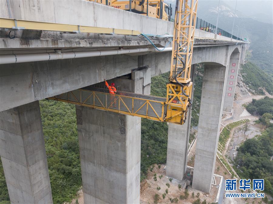 7月29日,在京礼高速的松山大桥,养护工人在桥检车平台上观测桥体结构。新华社记者 才扬 摄