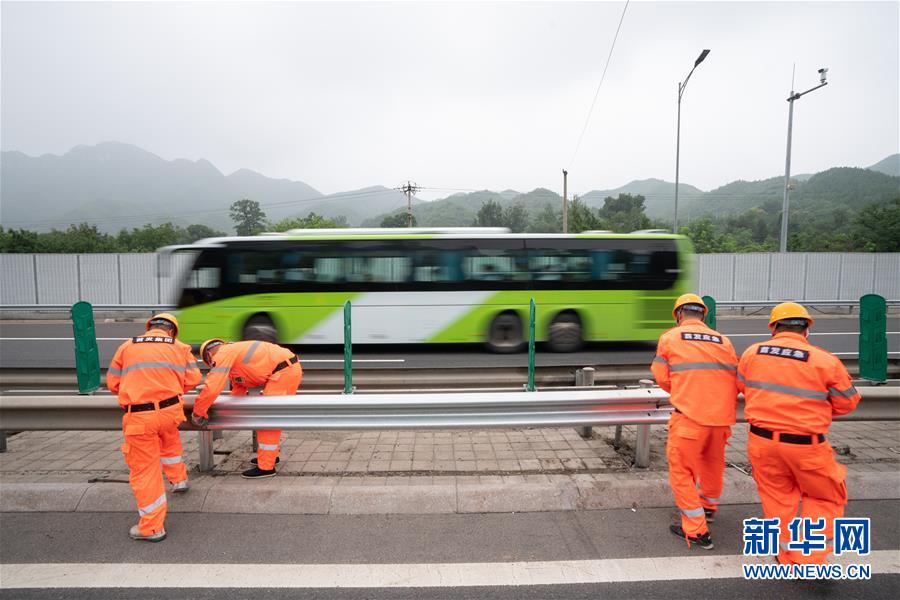 7月29日,在京藏高速出京方向43.5公里处,养护工人对道路设施进行修复。新华社记者 才扬 摄