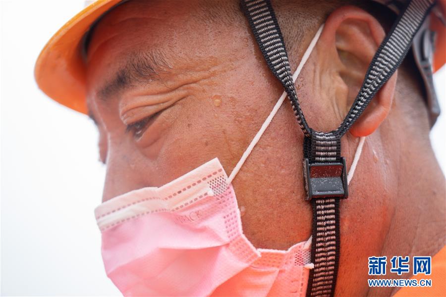 7月29日,在京藏高速出京方向43.5公里处,养护工人对道路设施进行修复时满头大汗。新华社记者 才扬 摄