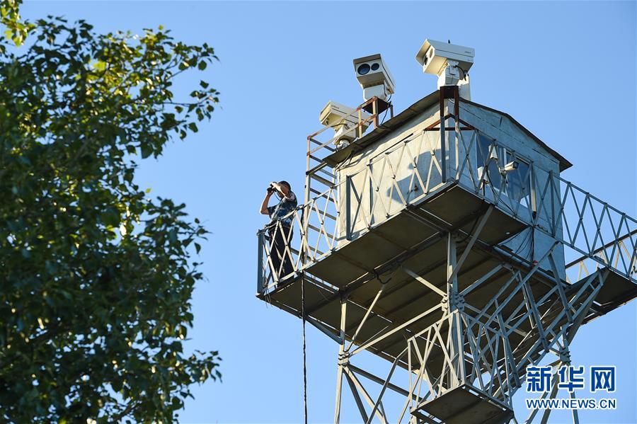 7月28日,任永奇在瞭望塔上观察鸟类活动情况。 新华社记者 彭源 摄