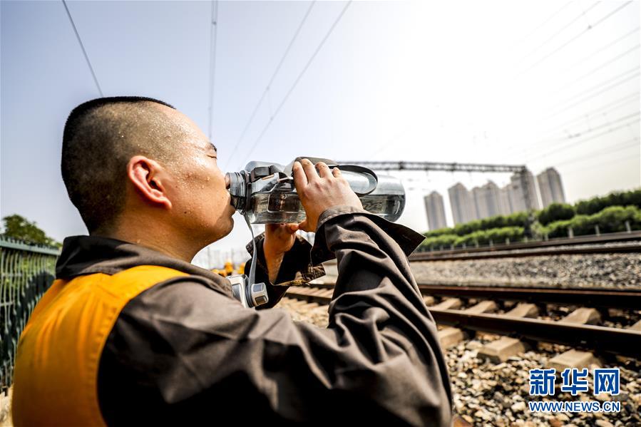 7月30日,天津工务段职工在检修间隙喝水休息。 夏日炎炎,中国铁路北京局集团有限公司天津工务段职工不畏酷暑,坚守岗位,对北塘站内钢轨进行检修,发现状况及时更换“病害钢轨”。 新华社发(李佳骏 摄)