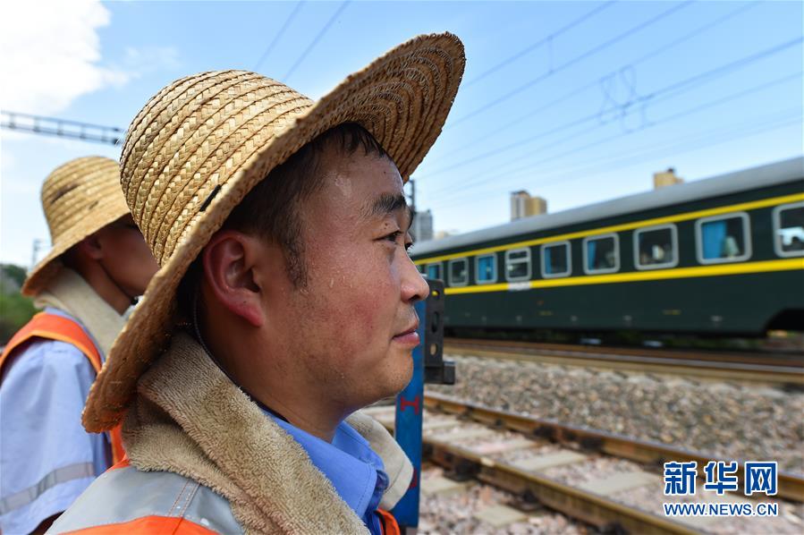 7月30日,在太中铁路山西吕梁段,刘锦鹏在巡热过程中等待列车经过。 太中线是从山西太原到宁夏中卫的一条铁路线,因夏日里轨道温度高,被人们称为“火焰山”。在沿线的吕梁山深处有这样一支青年队伍,他们在夏日炙烤的铁路线上进行巡热作业,防止高温天气里发生胀轨等问题隐患,保障行车安全。 刘锦鹏是中国铁路太原局集团有限公司太原南工务段吕梁线路车间的工长,他和他的巡热队员都是“90后”,他们每天要对管辖的17公里铁路线进行徒步巡查,对钢轨接头、道岔、绝缘接头等部位还要进行重点检查。虽然头上顶着烈日,脚下高温炙烤,但他们用汗水和坚守确保着铁路线每一天的安全与畅通。 新华社发(柴婷 摄)