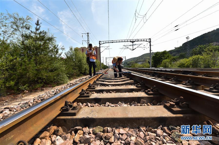 7月30日,在太中铁路山西吕梁段,刘锦鹏(右)和同事检查钢轨几何尺寸,防止超限。 新华社发(柴婷 摄)