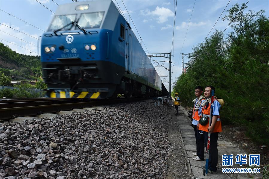 7月30日,在太中铁路山西吕梁段,刘锦鹏(右一)和同事等待列车经过。 新华社发(柴婷 摄)