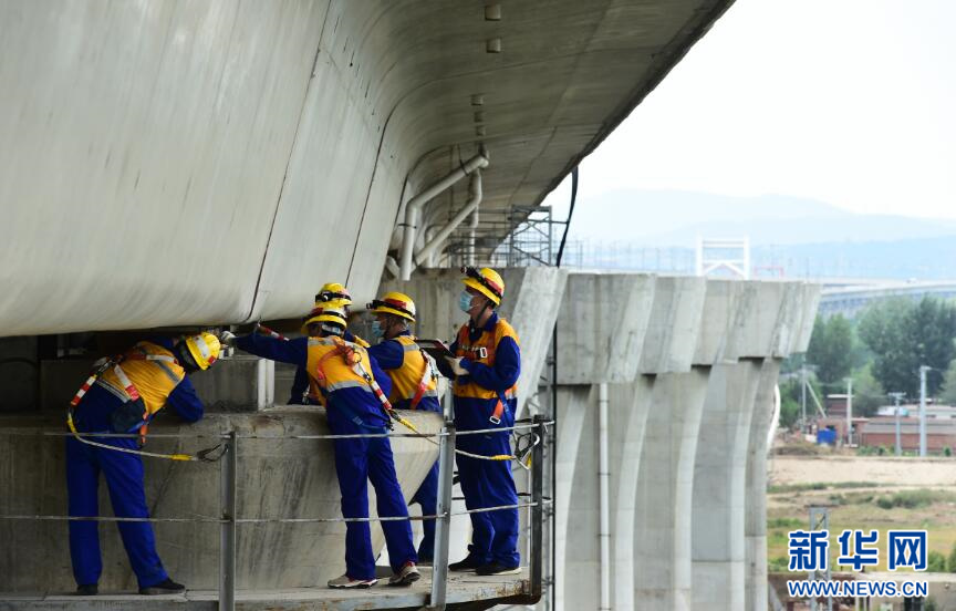图为工人在高铁桥上检查墩台设施。新华网姜冰摄