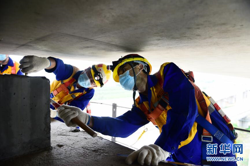 图为工人在对大桥支撑垫石进行检查。新华网姜冰摄