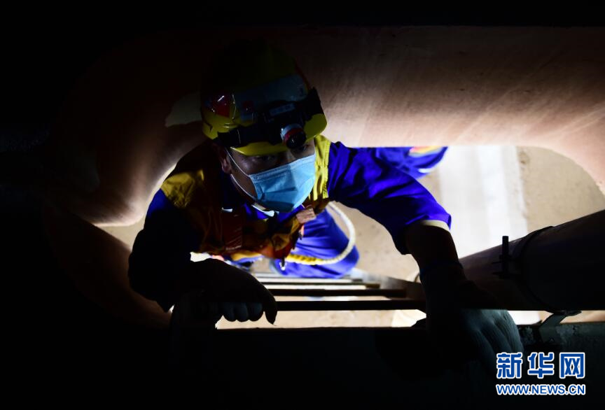 图为工人王力爬入桥梁内部准备作业。新华网姜冰摄