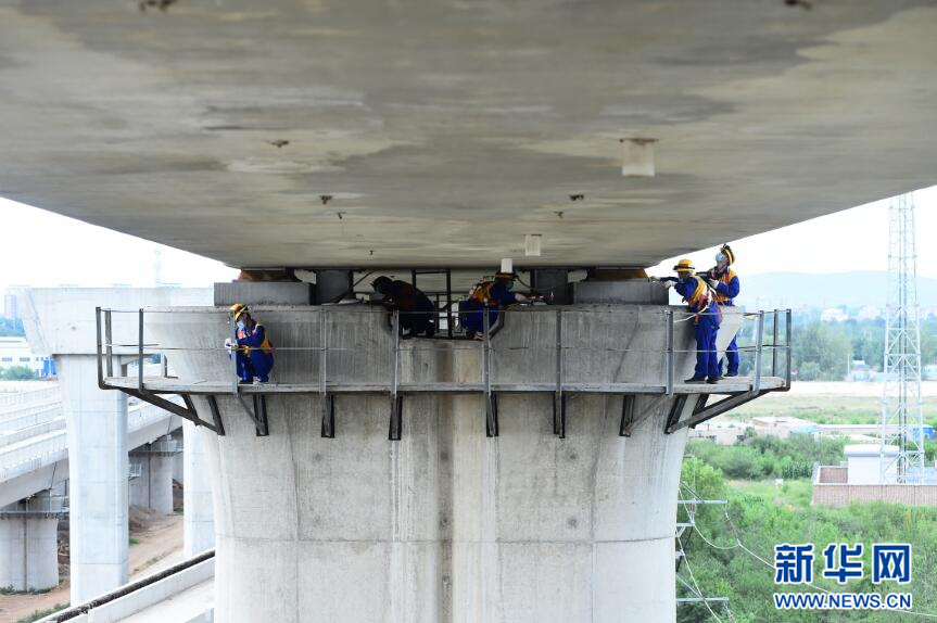 图为朝阳桥梁检查工区工人在对大桥墩台、支座、吊围栏等设施进行检查。新华网姜冰摄