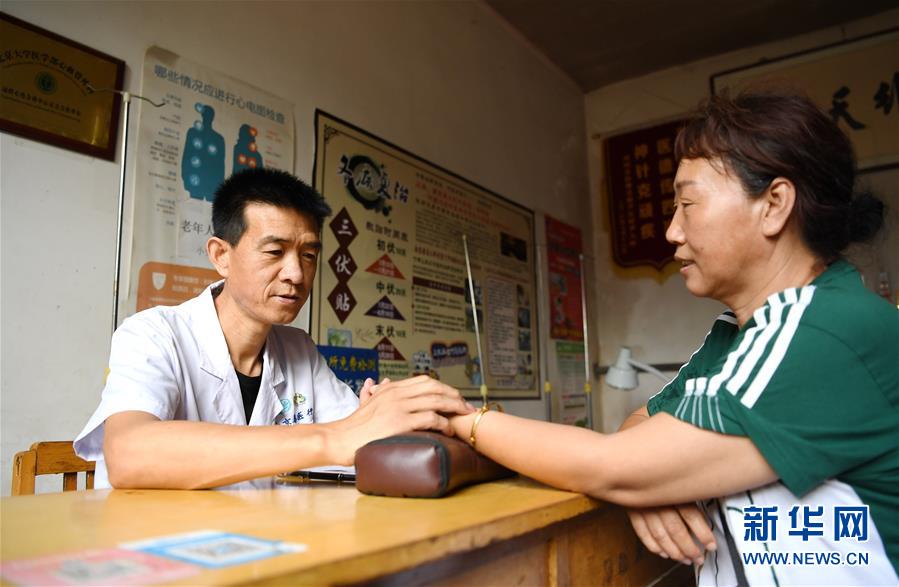 8月1日,徐宏业在村卫生室为村民把脉。 今年47岁的徐宏业是河北省河间市行别营乡小史村的一名乡村医生。1998年回到家乡后,徐宏业就一直扎根乡村,守护着村民的健康。22年来,无论春秋寒暑、路途远近,只要村民有看病需要,徐宏业就会出现在患者面前。在做好日常诊疗工作的同时,徐宏业常常放弃休息,入户巡诊,定期给村里的老人体检,针对慢性疾病开展随访,为村民建立起健康档案。 多年来,徐宏业还积极参与“善医行”公益活动,每年跟随团队到云南、四川等地的贫困山区开展义诊。 “村里的群众就是我的亲人,他们离不开我,我也离不开他们,当好一名乡村医生,是我这辈子的坚守。”徐宏业说。 新华社记者 朱旭东 摄