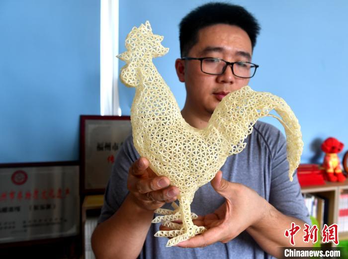 公鸡、天鹅、螃蟹、亭台楼阁……一个个以米为线缀连成的“高楼米线”作品玲珑洁白,栩栩如生。8月2日,在福建省福州高楼米线非遗传承基地,记者看到了福州高楼米线代表性传承人陈国锐的作品。高楼米线,是福州市长乐古槐镇高楼村独有的民间技艺。据查,它出现的历史已有上百年,由于各种因素,期间断档与空白近70年时间。后来,“80后”青年陈国锐将消失超过半个世纪的民间技艺摸索着重新恢复,目前,他是高楼米线的唯一代表性传承人。