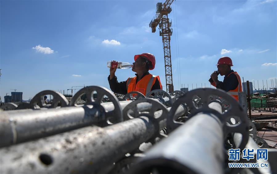 8月3日,工人在长江文创产业园项目工地休息喝水。 进入8月,武汉迎来持续高温天气。在湖北广电传媒基地工程的工地上,中建三局总承包公司1500多名工人持续奋战,力保工程进度。该工程是我国中部地区首个国家级广播影视媒体基地,由湖北广电传媒大厦项目、长江文创产业园项目、广电生活配套项目三大板块组成,总建设规模130万平方米。自今年3月25日获批正式复工以来,承建方克服困难,把因疫情影响耽误的工期赶了回来,预计将按原计划完成建设任务。 新华社记者 程敏 摄