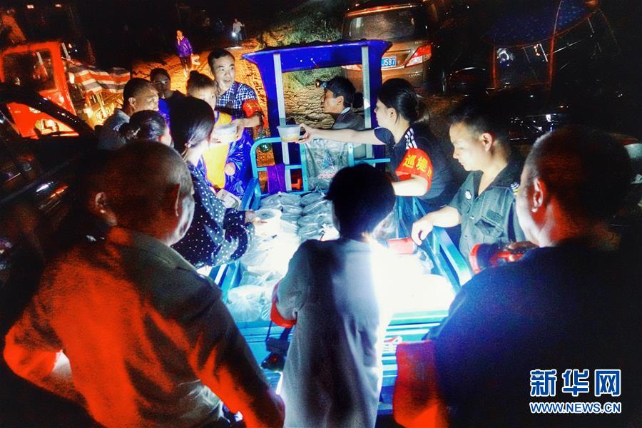 7月8日,在湖南省常德市津市市,群众带着米粉慰问在防洪大堤上值守的工作人员。 新华社发