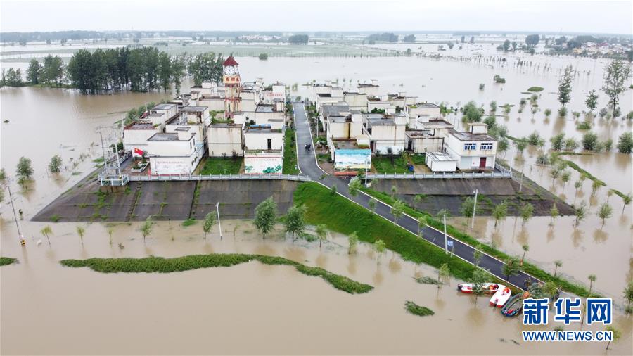 这是被洪水包围的安徽省阜南县曹集镇西田坡庄台,蓄洪区内的所有庄台上都有党员干部值守(7月24日摄,无人机照片)。 新华社记者 张端 摄