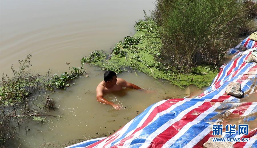 7月25日,安徽省庐江县白山镇金大圩段值班人员、党员徐经宝在水中处理险情。 新华社发(钱良好摄)
