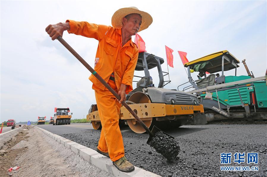 8月4日,修路工人在安徽省淮北市濉溪县五沟镇境内的淮六路(淮北至六安)施工现场铺设沥青。