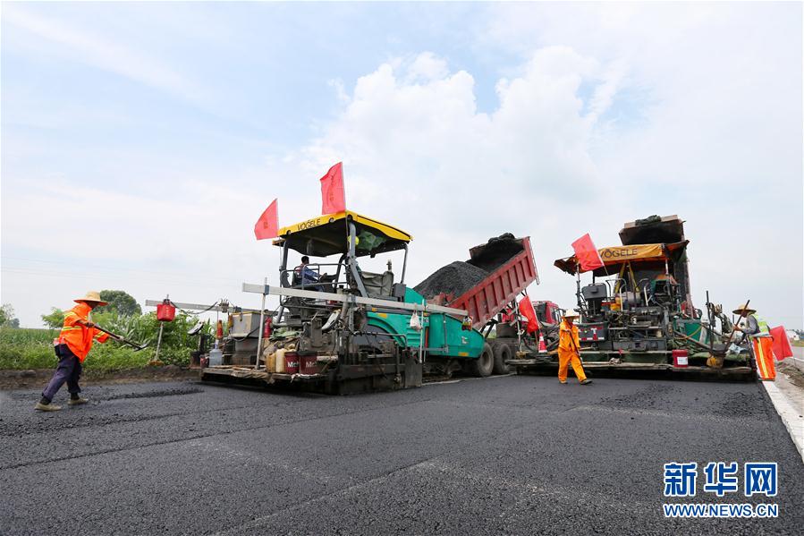 8月4日,修路工人在安徽省淮北市濉溪县五沟镇境内的淮六路(淮北至六安)施工现场铺设沥青。 新华社发(万善朝 摄)