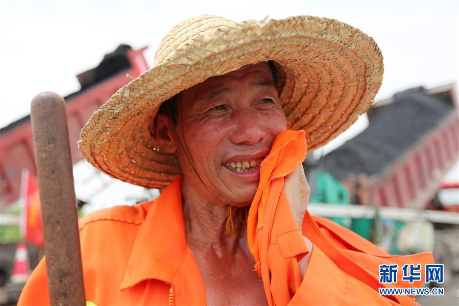 8月4日,修路工人在安徽省淮北市濉溪县五沟镇境内的淮六路(淮北至六安)施工现场擦拭脸上的汗水。 新华社发(万善朝 摄)