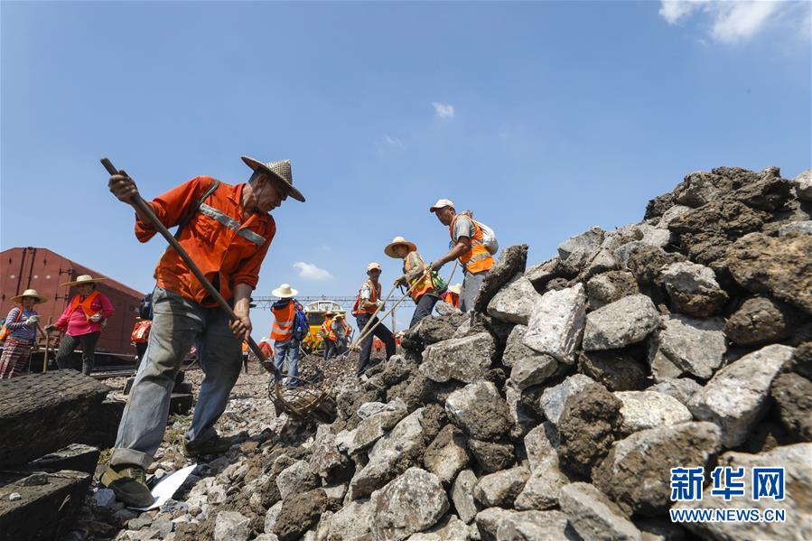 8月4日,鹰潭工务机械段的工作人员对铁轨上的石砟进行清理。 新华社记者 胡晨欢 摄