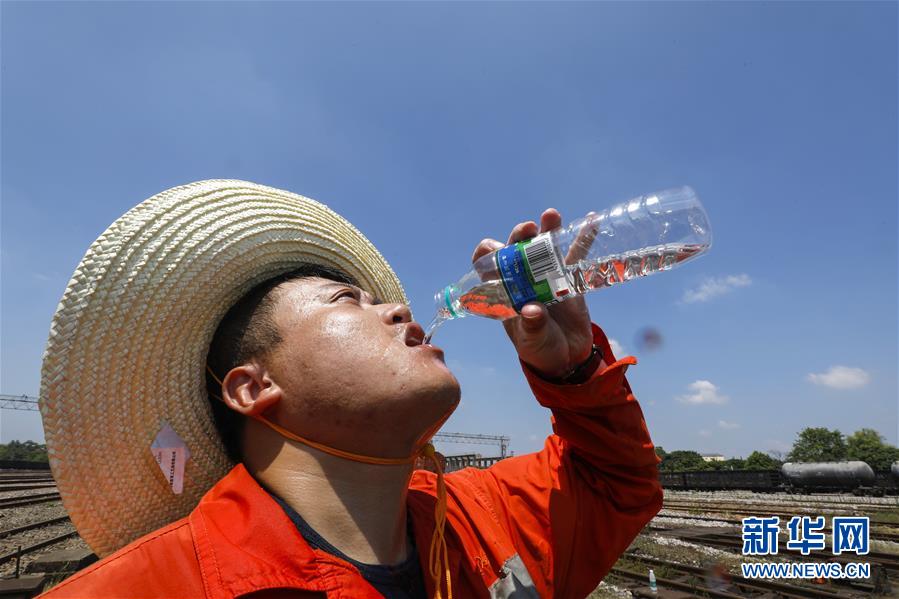 8月4日,一名鹰潭工务机械段的工作人员饮水解渴。 新华社记者 胡晨欢 摄
