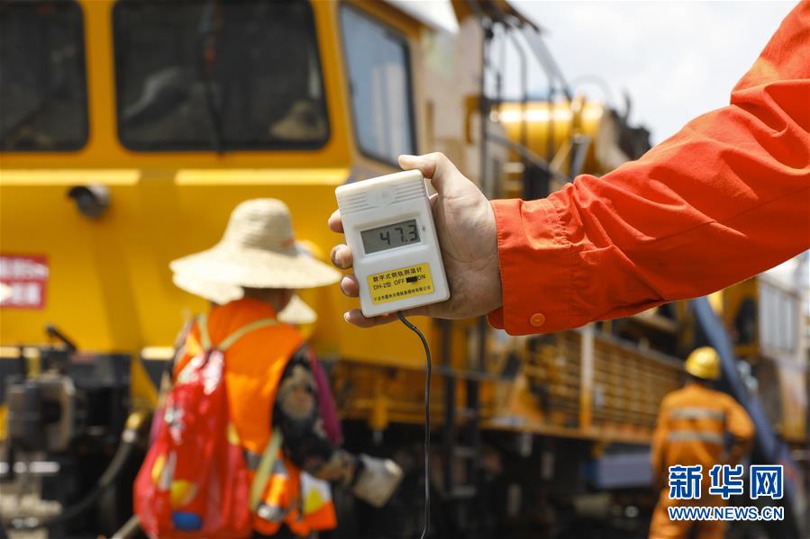 8月4日,鹰潭工务机械段的工作人员施工作业时,铁轨温度高达47.3摄氏度。 新华社记者 胡晨欢 摄
